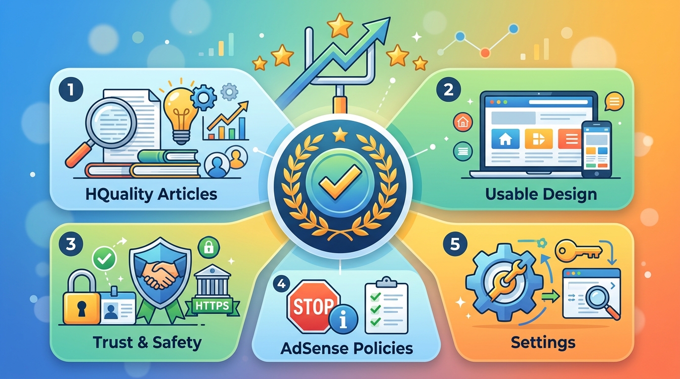 アドセンス審査を突破するために重要なのは、Googleが求める「ユーザーファースト」の視点と、サイトの「信頼性」です。この二つの要素を兼ね備えるために必要な5つの条件を具体的に見ていきましょう。